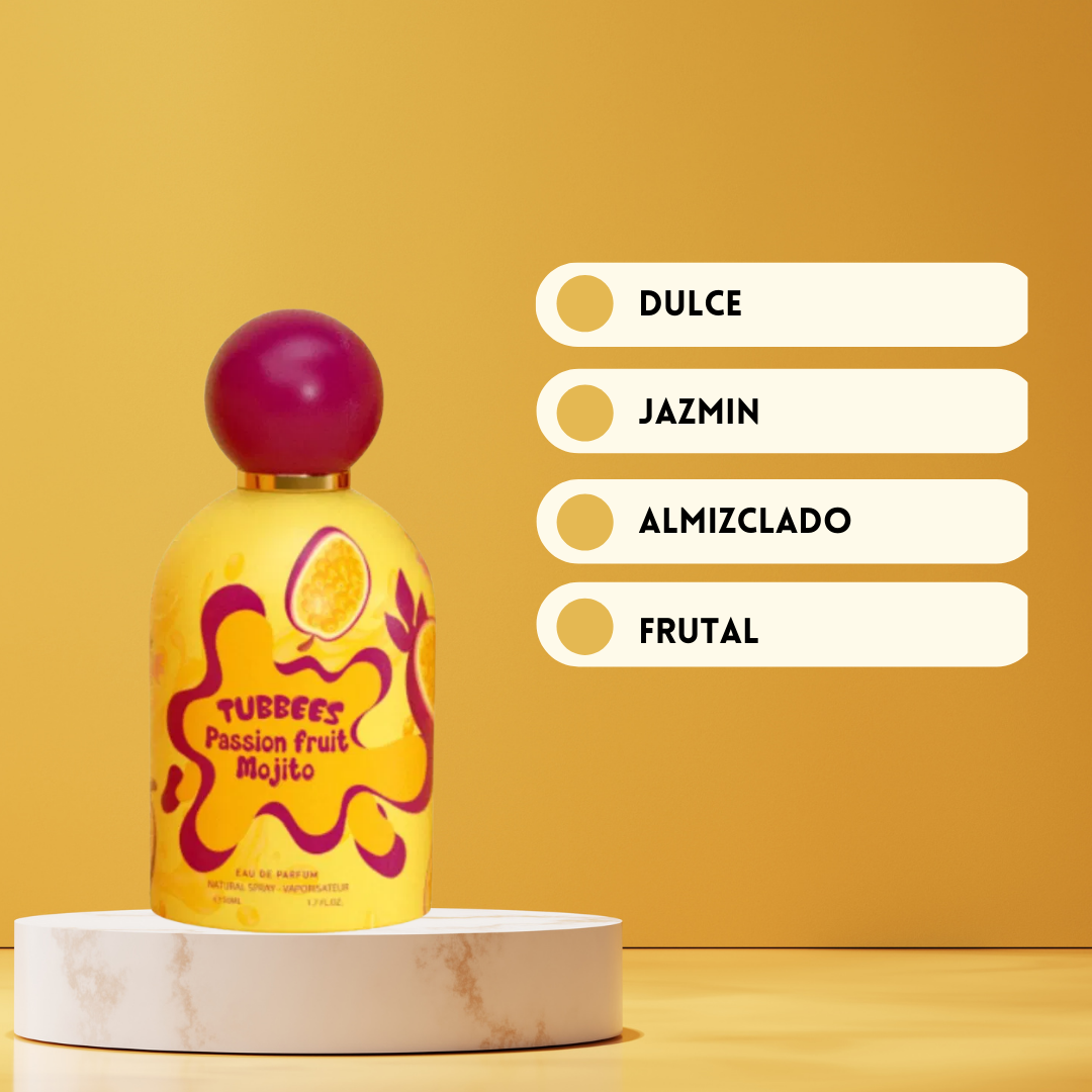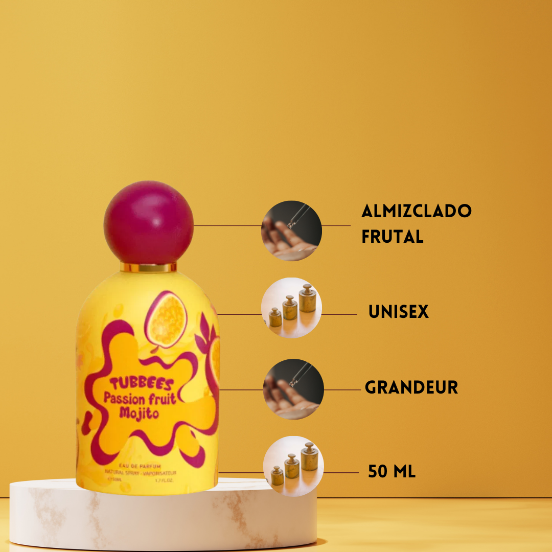Tubbees Passion Fruit Mojito de Grandeur Eau de Parfum Unisex 50 ml es una explosión de delicias tropicales inspirada en un cóctel refrescante bajo el sol. Creada en los Emiratos Árabes Unidos, esta fragancia abre con una mezcla chispeante de maracuyá, flores frescas, notas tropicales, grosella negra y piña, que aporta energía y alegría inmediata. En el corazón, la composición se vuelve más seductora y equilibrada gracias a la flor de azahar, la frambuesa, el mango y el jazmín, creando una armonía frutal-floral moderna y elegante. El fondo se asienta con almizcle suave, un dulzor azucarado y sándalo cremoso, dejando una estela limpia, cálida y duradera. Passion Fruit Mojito es ideal para quienes buscan una fragancia unisex vibrante, tropical y sofisticada, perfecta para cualquier momento del día.