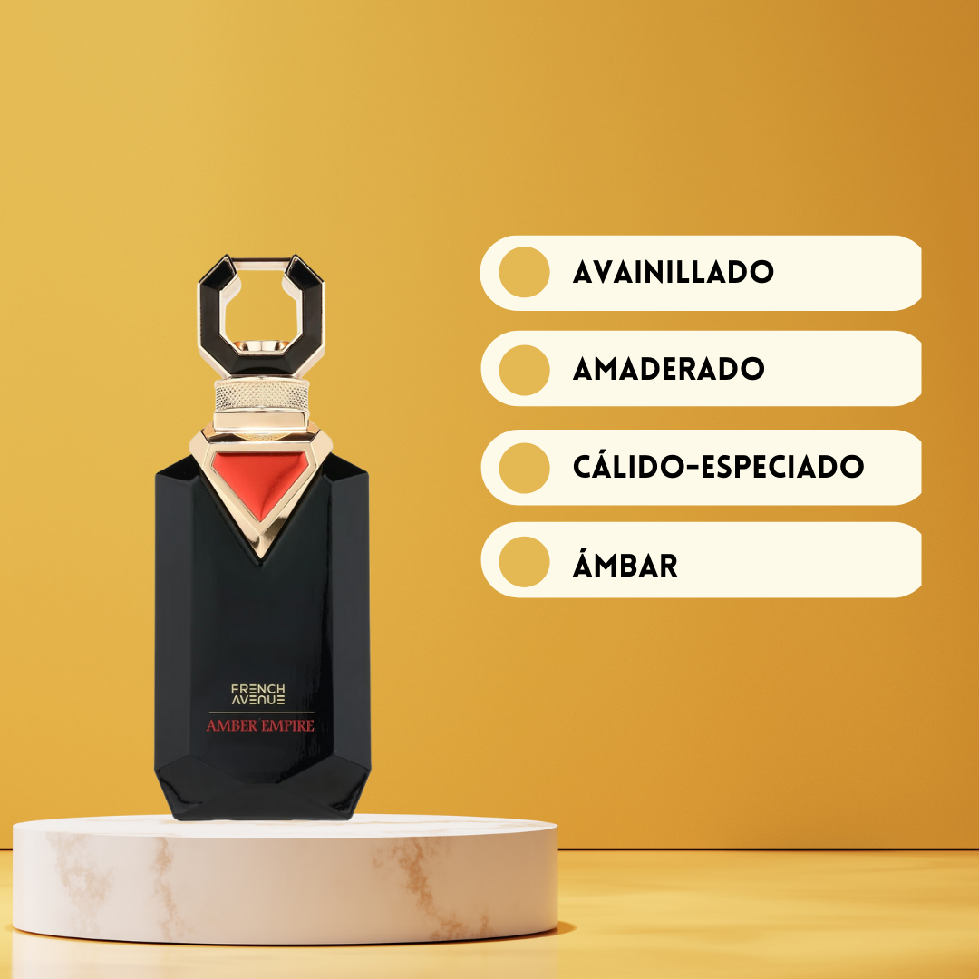 Amber Empire de French Avenue Eau de Parfum 100 ml (2025) es una fragancia oriental-amaderada que rinde homenaje a la elegancia masculina en su máxima expresión. Su apertura combina lujosas notas orientales con el dulzor sensual de la vaina de vainilla, un toque refinado de licor y la suavidad de la madera de cachemira, creando una introducción cálida y envolvente. En el corazón, la riqueza del ámbar se mezcla con la dulzura sofisticada de la caña de azúcar y la fuerza del cedro, aportando equilibrio y carácter. Finalmente, el fondo revela una base aterciopelada de haba tonka, ládano, sándalo y almizcle, ofreciendo una estela duradera, sensual y poderosa. Amber Empire es la fragancia perfecta para hombres que buscan destacar con una presencia magnética y elegante.