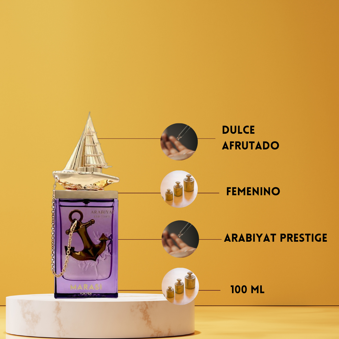 Marasi For Her de Arabiyat Prestige Eau de Parfum Mujer (2026) es una fragancia floral frutal gourmand creada por la perfumista Angéline Leporini, diseñada para mujeres que aman la dulzura sofisticada y el carácter vibrante. La apertura combina la intensidad jugosa de la frambuesa y el mango con la frescura de la bergamota y el toque cremoso de la avellana, creando una salida luminosa y adictiva. En el corazón, el perfume revela su faceta más dulce y femenina con flor de azahar, algodón de azúcar, pachulí y violeta, equilibrando lo gourmand con elegancia floral. El fondo se asienta sobre una base envolvente de haba tonka, vainilla, caramelo y almizcle, dejando una estela cálida, seductora y duradera. Marasi For Her es ideal para la noche, eventos especiales o para mujeres que desean destacar con un perfume dulce, moderno y absolutamente memorable.