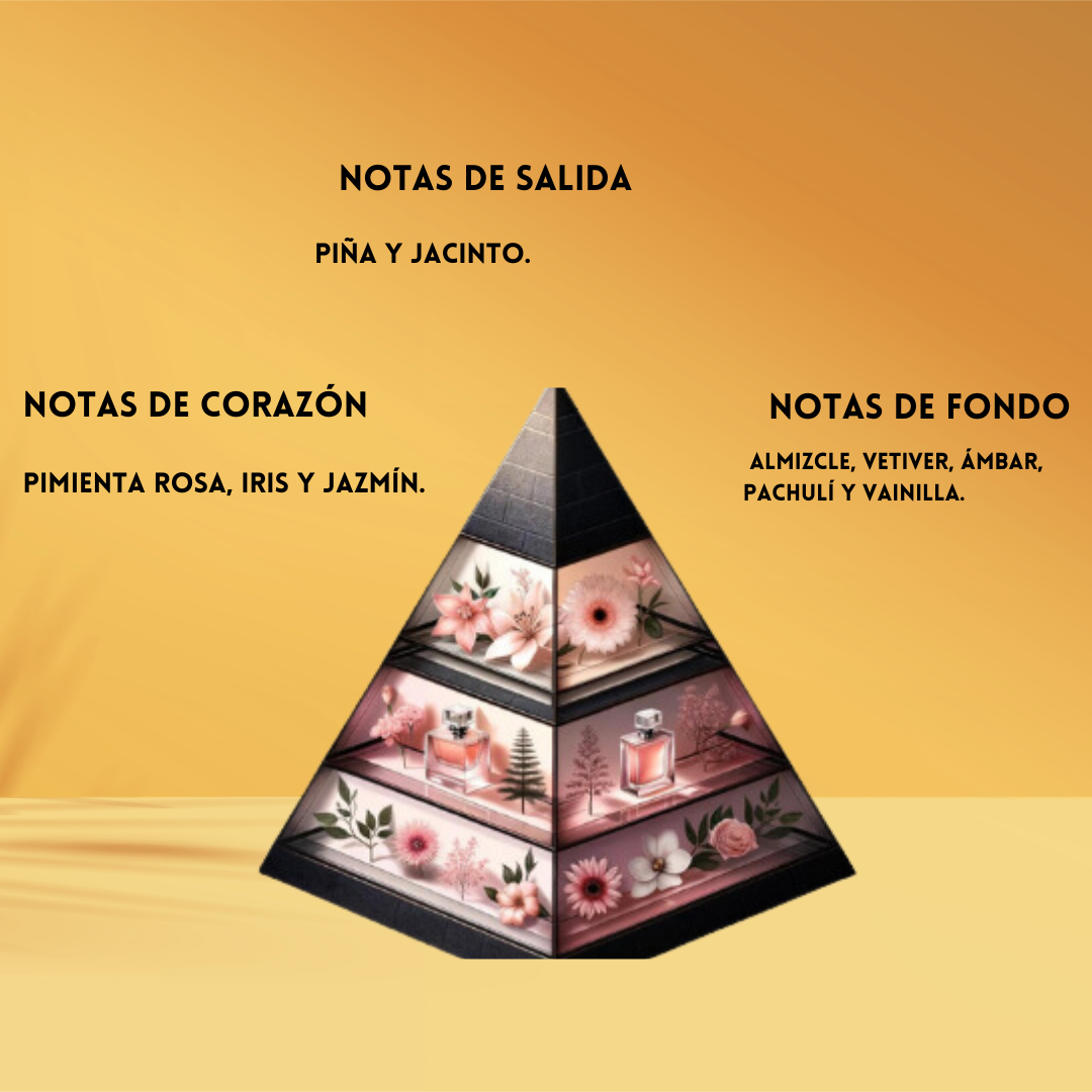 Depuis le premier instant, le parfum captive avec la douceur exotique de l'ananas et la fraîcheur florale du jacinthe. Au cœur, le jasmin et le poivre rose de Madagascar apportent une touche épicée et sensuelle. Enfin, les notes de fond de musc, vanille, vétiver, patchouli et ambre créent une traînée chaude et persistante qui enveloppe les sens.