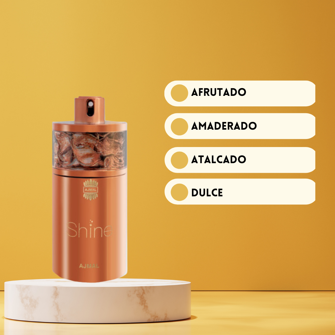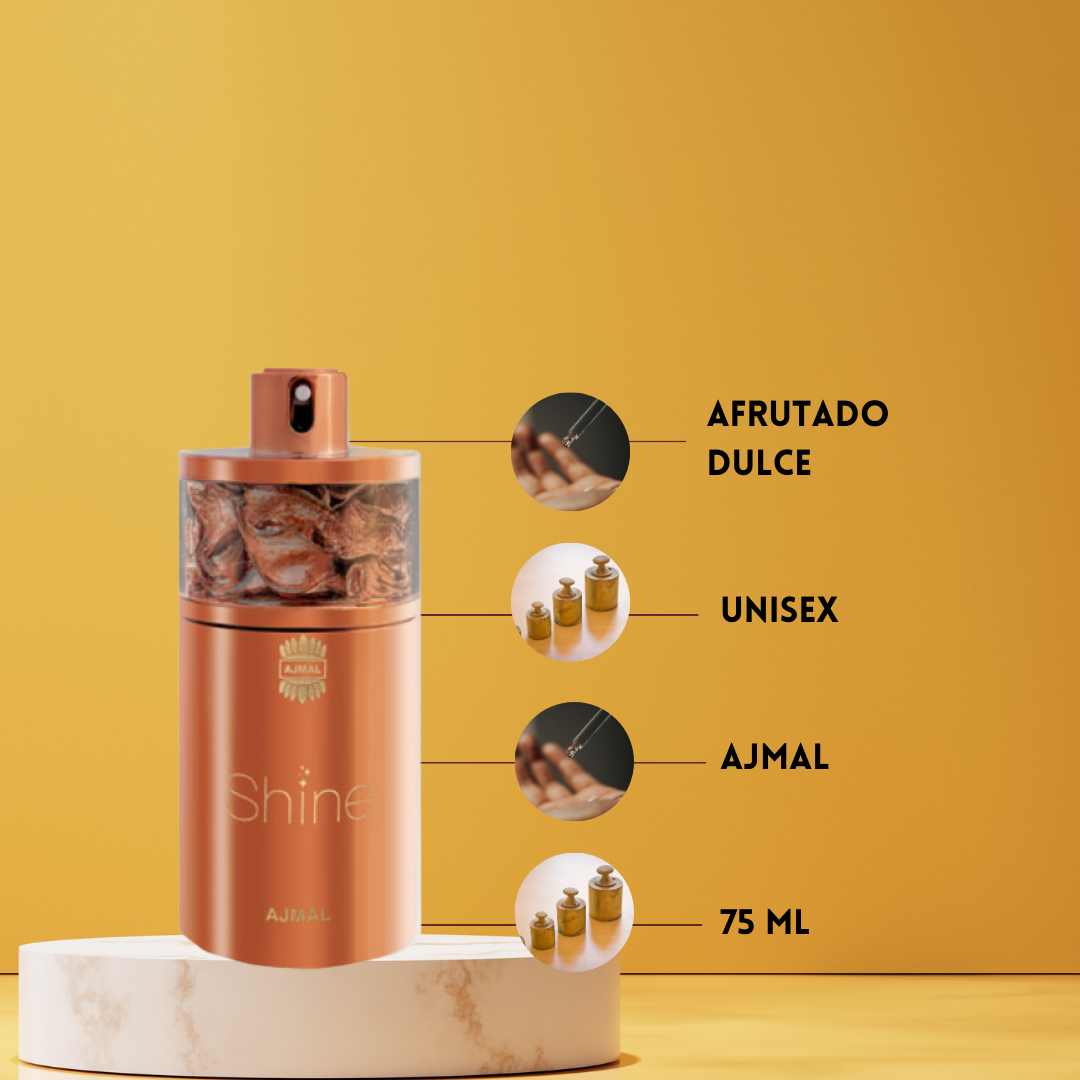 Ajmal Shine es una fragancia que captura la esencia de la feminidad moderna con una combinación armoniosa de notas frutales y florales. Diseñada para mujeres que irradian elegancia y encanto, esta eau de parfum de 75 ml ofrece una experiencia olfativa envolvente y duradera.