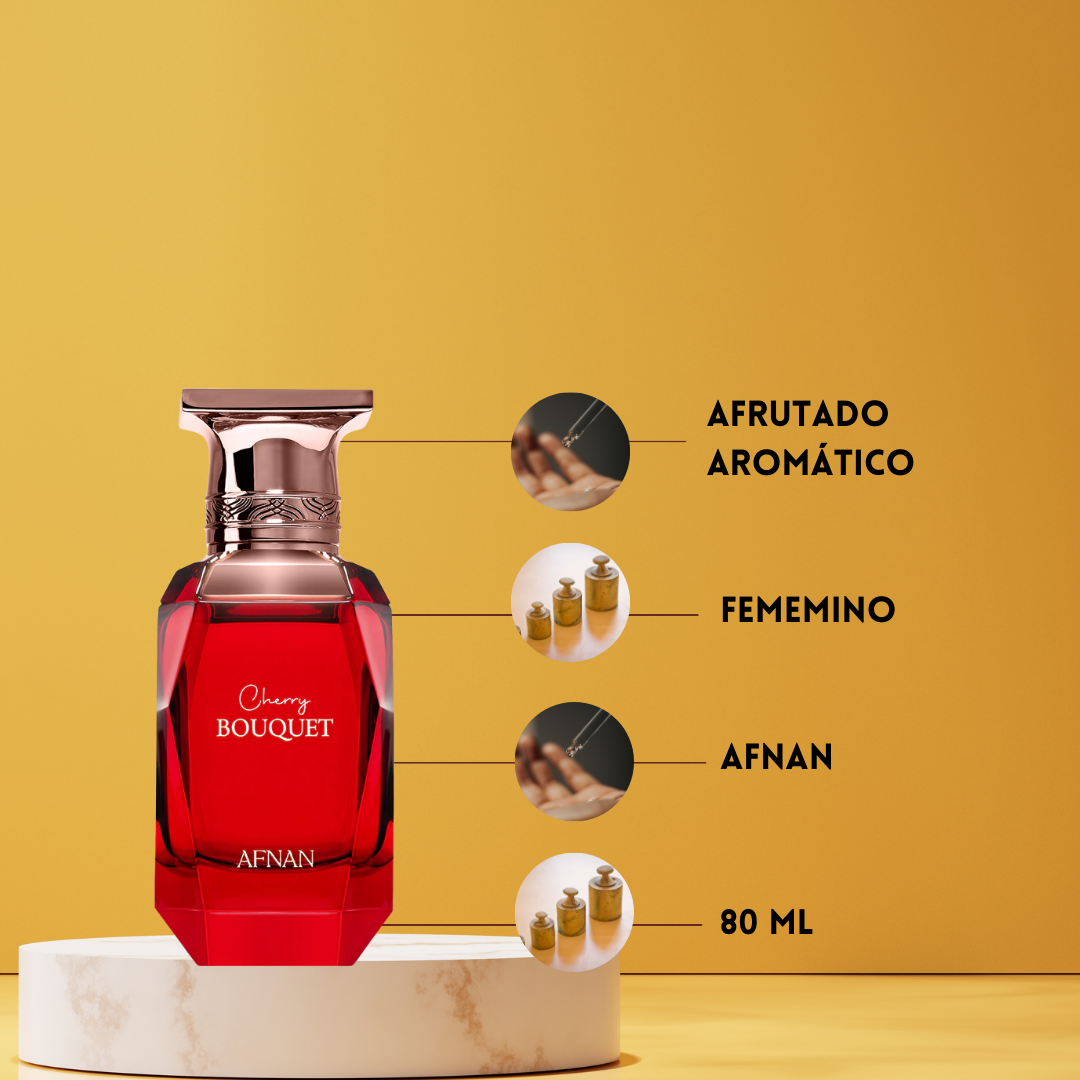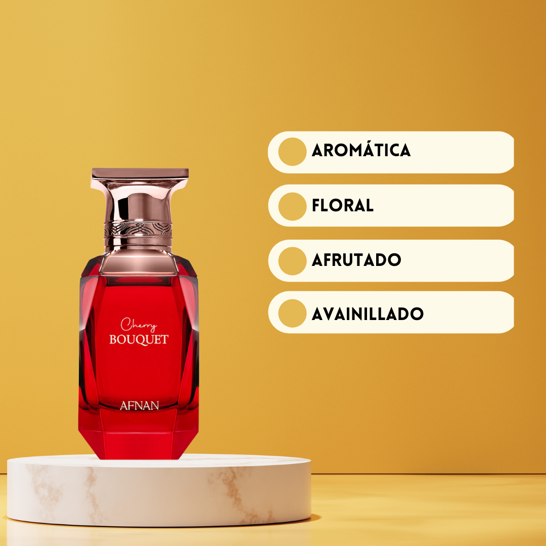 Cherry Bouquet de Afnan Perfumes es una fragancia femenina que celebra la intensidad y dulzura de la cereza en una composición floral frutal gourmand. Diseñada para la mujer moderna y segura de sí misma, esta esencia combina notas frutales, florales y especiadas para crear una experiencia olfativa envolvente y sofisticada.