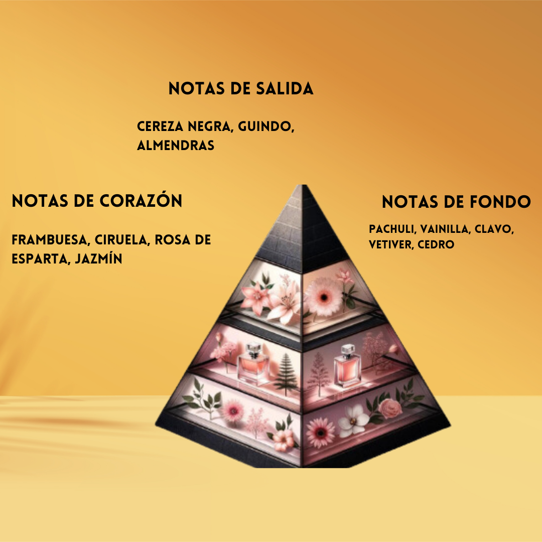 Notas de Corazón: Frambuesa, ciruela, rosa de Damasco y jazmín sambac.