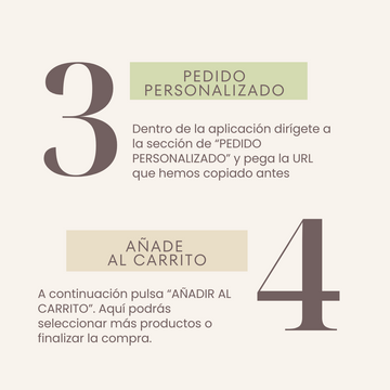 Dentro de la aplicación dirígete a la sección de "PEDIDO PERSONALIZADO" y pega la URL que hemos copiado antes. A continiación pulsa "añadir al carrito". Aquí podrás añadir más productos (del mismo modo que antes) o finalizar la compra.