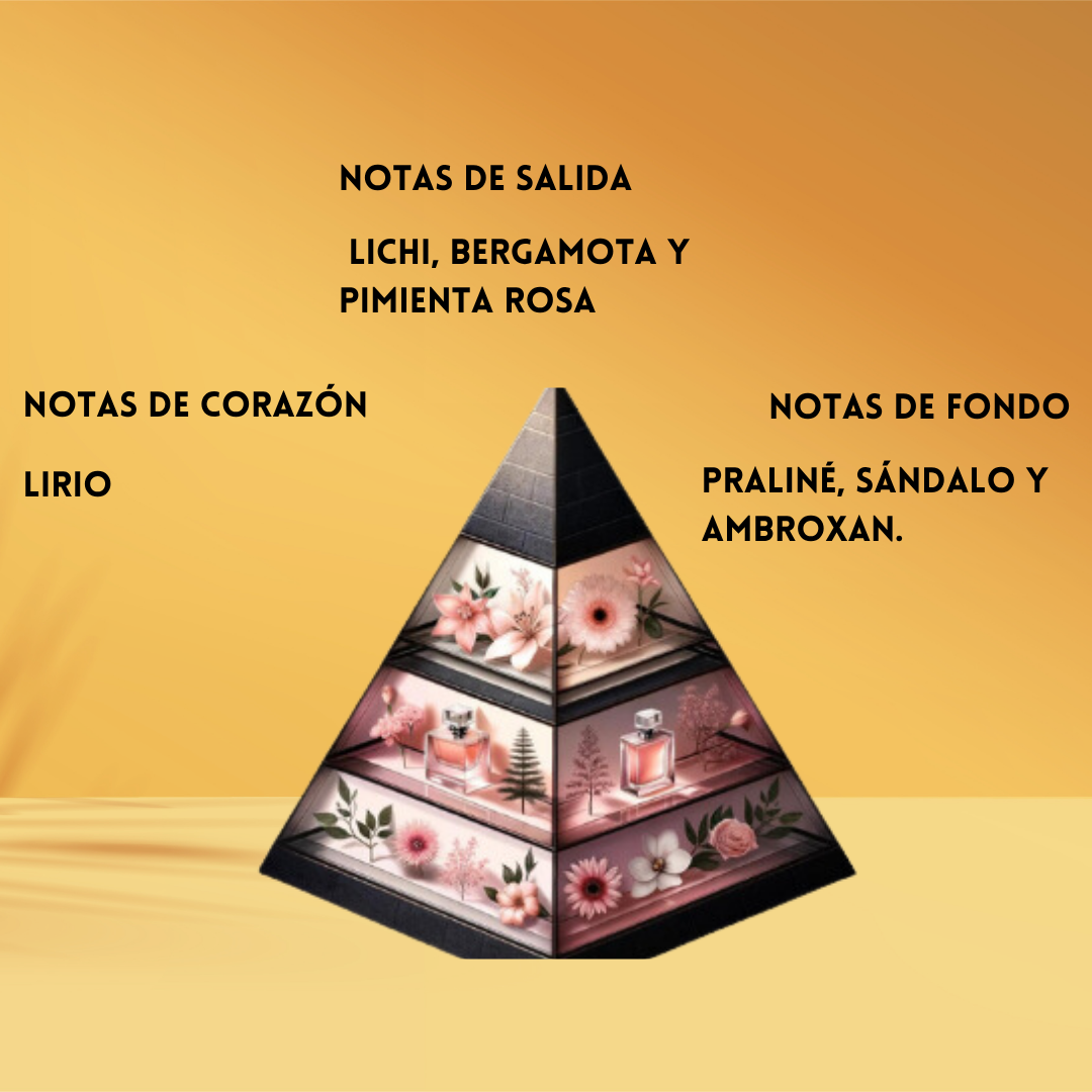 En su corazón, un bouquet floral se enriquece con especias cálidas, agregando misterio y sofisticación. Las notas finales de ámbar suave, maderas cremosas y almizcle crean una base envolvente que perdura en la piel, dejando una estela seductora y refinada.