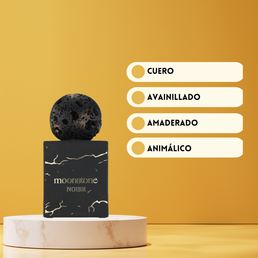 Desde las primeras notas, Moonstone Noire envuelve con un acorde ahumado que establece un tono intrigante. En el corazón, el cedro y el vetiver aportan una frescura terrosa y refinada. Finalmente, la base revela una combinación cálida y sensual de vainilla, cuero y oud blanco, dejando una estela duradera y envolvente.