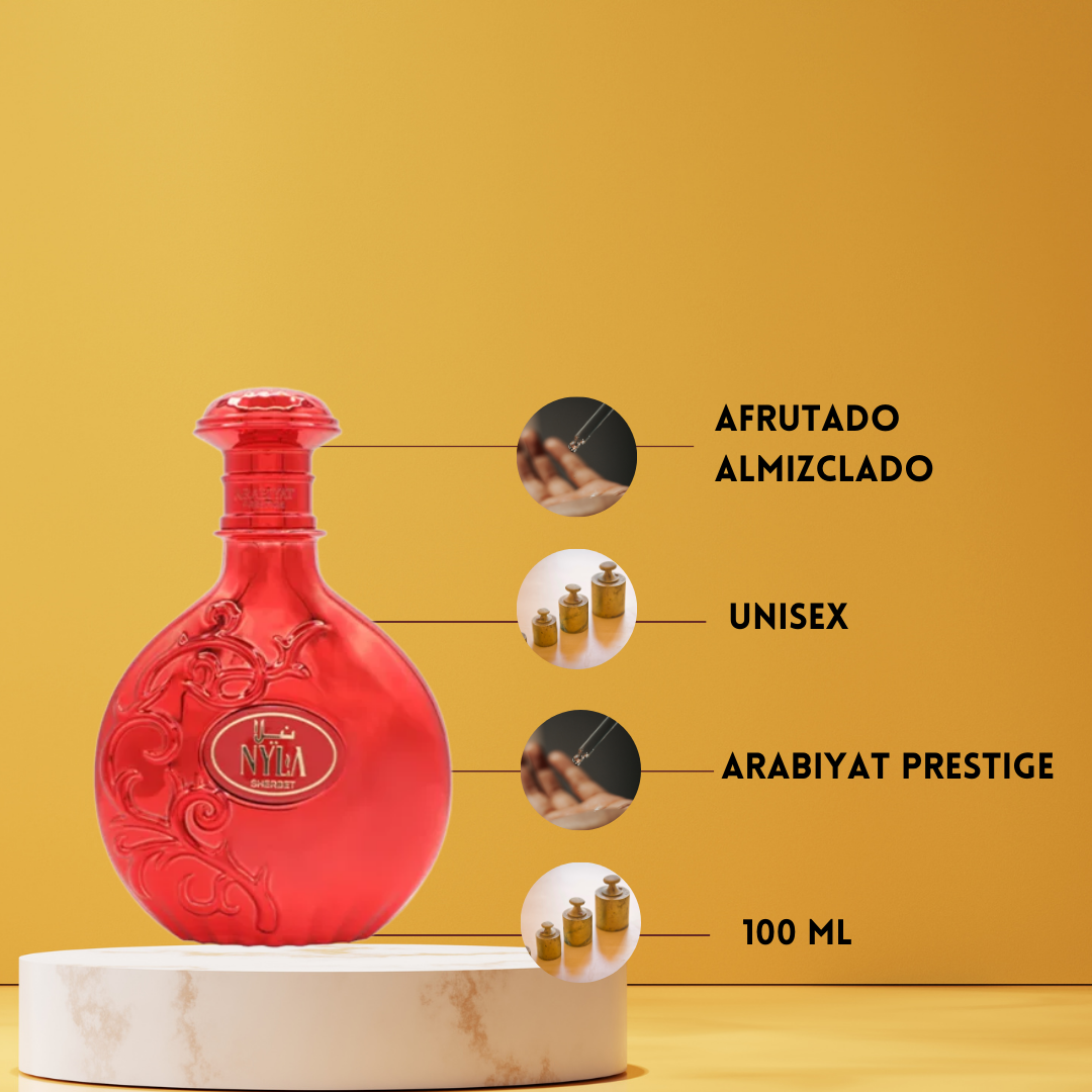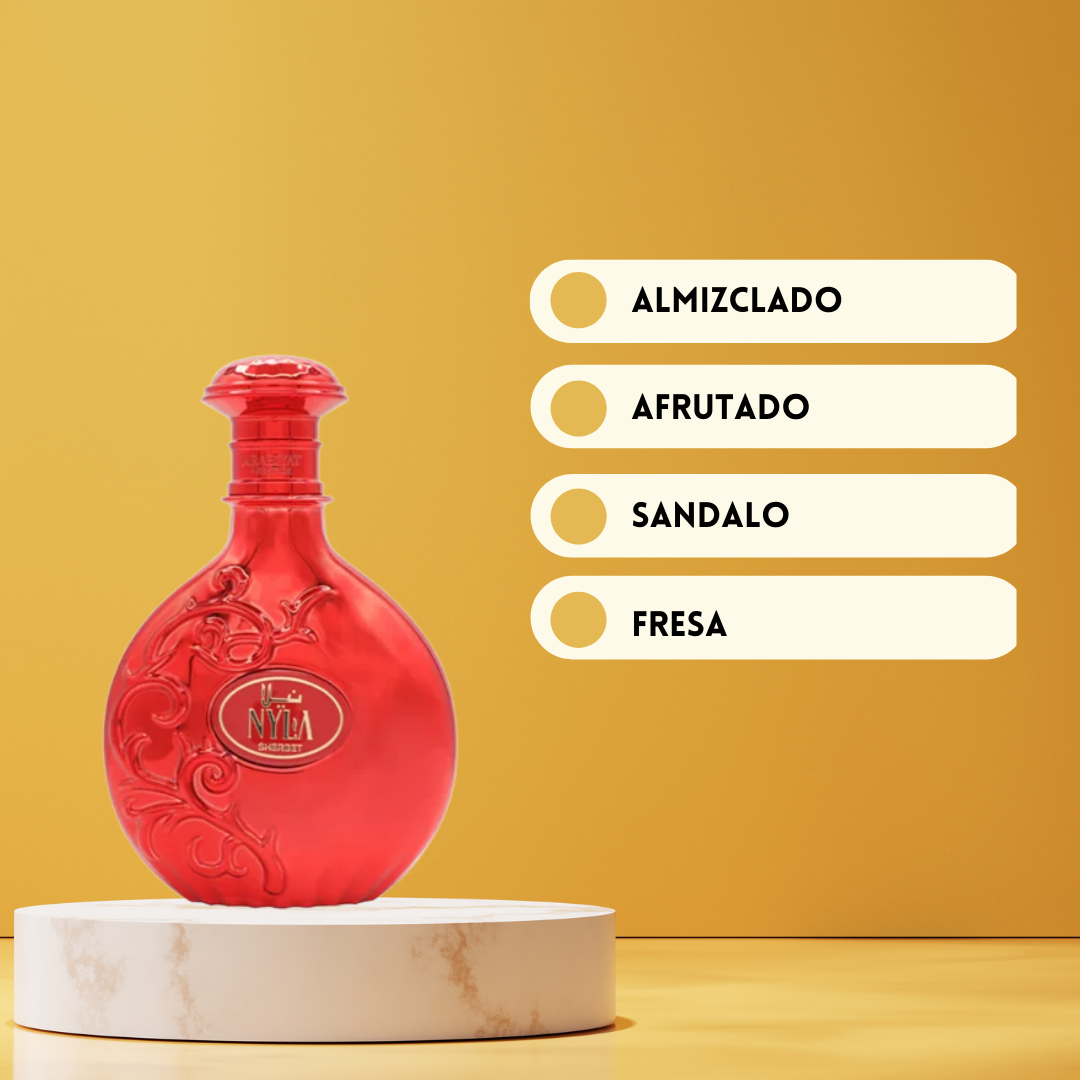 Nyla Sherbet de Arabiyat Prestige Eau de Parfum Mujer es una fragancia diseñada para mujeres que aman los perfumes dulces, afrutados y seductores con un acabado elegante. Desde la primera pulverización, esta creación envuelve los sentidos con una apertura vibrante de fresa y mandarina, aportando una sensación fresca, alegre y agridulce que captura la atención al instante. En el corazón, la ciruela despliega su carácter jugoso y aterciopelado, añadiendo profundidad, sofisticación y un toque sensual a la composición. El fondo se asienta sobre una base cálida y envolvente de almizcle y sándalo, que proporciona cremosidad, fijación y una estela duradera y femenina. Nyla Sherbet es una fragancia ideal tanto para el día como para la noche, perfecta para mujeres modernas que desean destacar con un aroma dulce, refinado y memorable.
