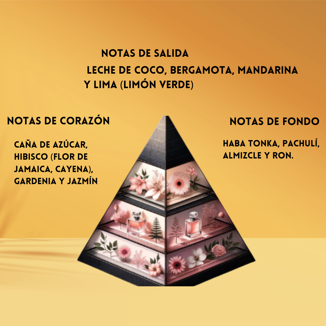 • 🌺 Corazón floral & dulce: Caña de Azúcar gourmand, Hibisco exótico, Gardenia cremosa y Jazmín radiante.