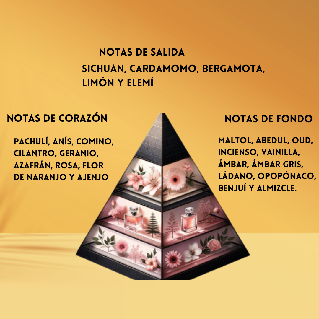 • 🌸 Corazón especiado & floral: Pachulí terroso, Anís, Comino, Cilantro, Geranio, Azafrán, Rosa, Flor de Naranjo y Ajenjo.