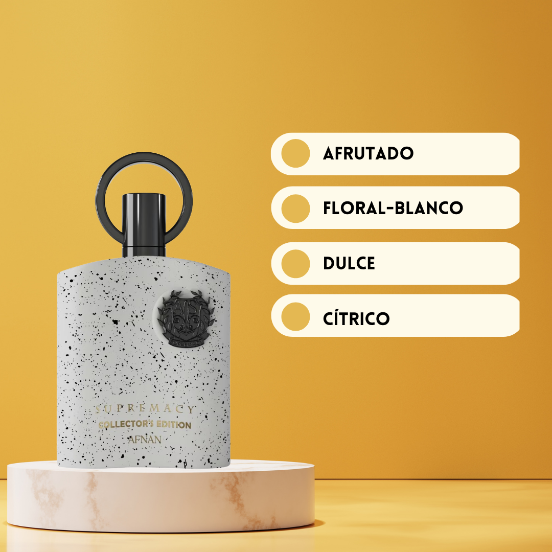 Supremacy Collector's Edition es una fragancia diseñada para el hombre moderno que disfruta de un aroma sofisticado y con carácter. Su apertura de piña y cítricos aporta frescura y energía, mientras el corazón ahumado de abedul y ámbar introduce calidez y personalidad. La base amaderada-muscosa ofrece una estela envolvente y refinada sin ser invasiva. Una elección infalible para destacar con elegancia en cualquier ocasión.