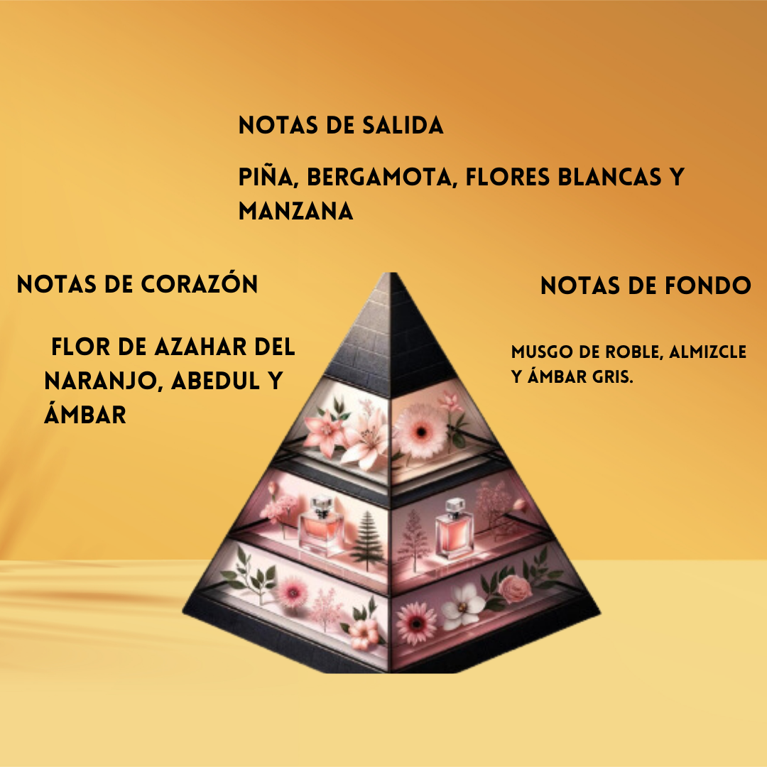 Notas de Salida: Piña, bergamota, manzana, flores blancas