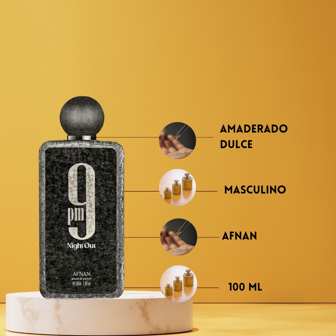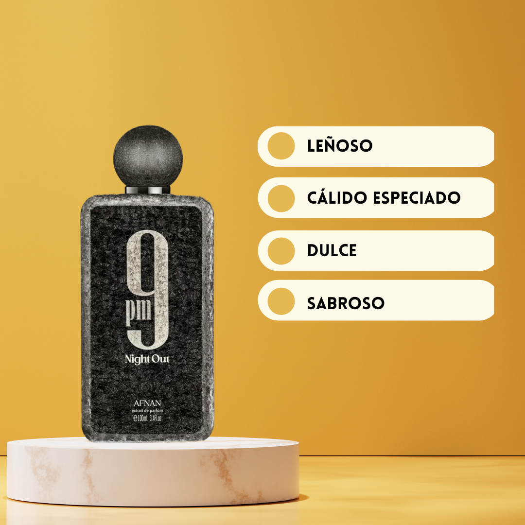 9 PM Night Out de Afnan Eau de Parfum Unisex (2026) es una fragancia oriental especiada creada por los perfumistas Quentin Roussel e Imran Fazlani, pensada para quienes buscan un aroma nocturno intenso, moderno y seductor. La apertura combina la frescura exótica de la pitahaya con la elegancia de la lavanda, el carácter del coñac, la dulzura de la manzana y el toque cítrico de la bergamota, creando un inicio vibrante y adictivo. En el corazón, el toffee aporta dulzura gourmand que se fusiona con la gamuza, el cardamomo, el cedro y la mahonia, generando un equilibrio entre suavidad, especias y maderas. El fondo revela una base profunda y envolvente de haba tonka, Ambrofix™, madera de akigala y pachulí, dejando una estela cálida, sensual y duradera. 9 PM Night Out es ideal para noches, citas o eventos especiales donde quieres destacar con un perfume elegante y magnético.