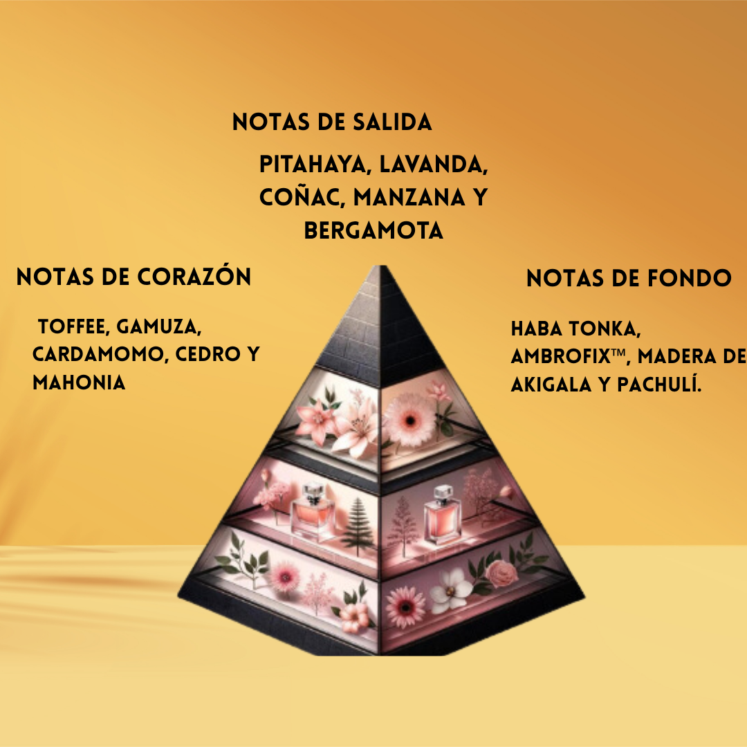- 🍎🍸 Salida vibrante & adictiva: Pitahaya exótica, Lavanda elegante, Coñac intenso, Manzana fresca y Bergamota luminosa.